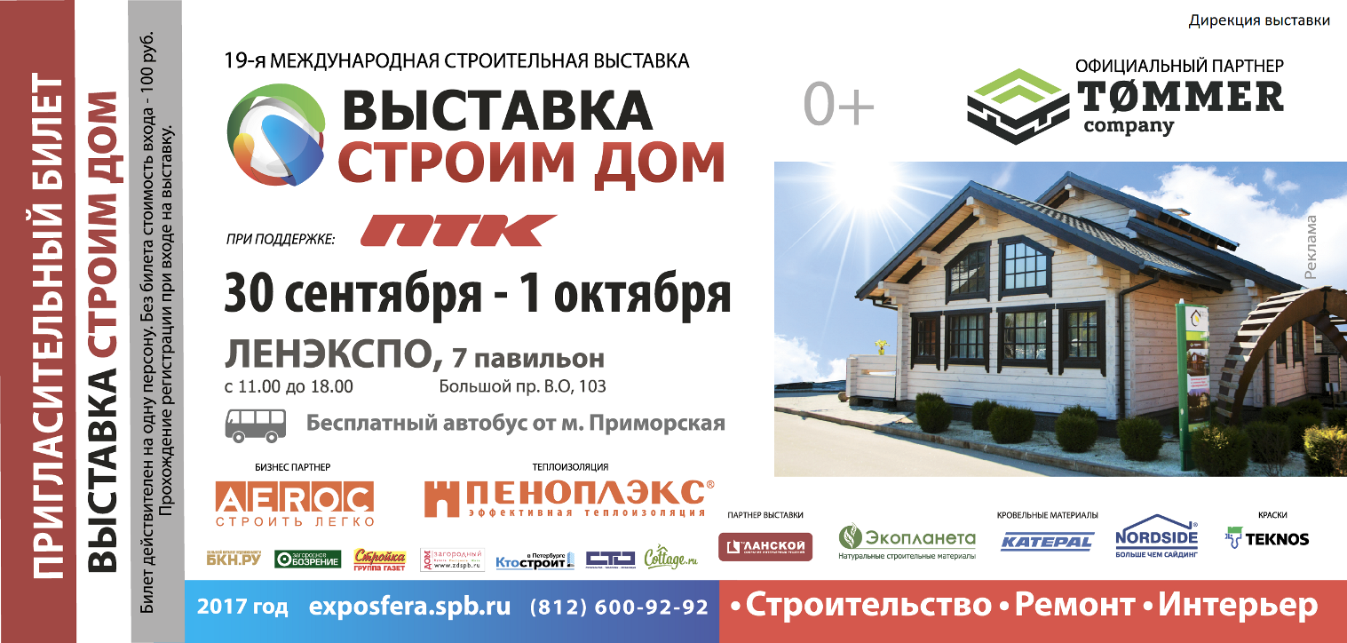 «Строим Дом» - популярная среди петербуржцев специализированная строительная выставка-продажа. Посетителей ждут бесплатные консультации, акции, скидки, «Шоу Строим Дом» с интерактивными мастер-классами. 19-я выставка «Строим Дом» будет проходить в 7-м павильоне ЛЕНЭКСПО в Гавани. Мероприятие существует с 2008 года и проходит дважды в год. Сегодня - это крупнейший проект данной тематики на северо-западе. Разделы выставки: загородное строительство, недвижимость, строительные технологии и материалы, инженерные системы, кровля, интерьер и отделка, специализированная пресса. ![]() Ждем Вас на нашем стенде С12! Мы расскажем: - Вы получите качественную консультацию по всем вопросам. касаемо строительства будущего дома - Вы узнаете, почему с ООО "СТК ПАРТНЕР" выгодно строить 30 сентября - 1 октября 2017 года, Ленэкспо, 7 павильон Большой пр В.О, 103, время работы с 11:00 до 18:00 Бесплатные автобусы от м. Приморская. www.exposfera.spb.ru (812) 600-92-92 | |